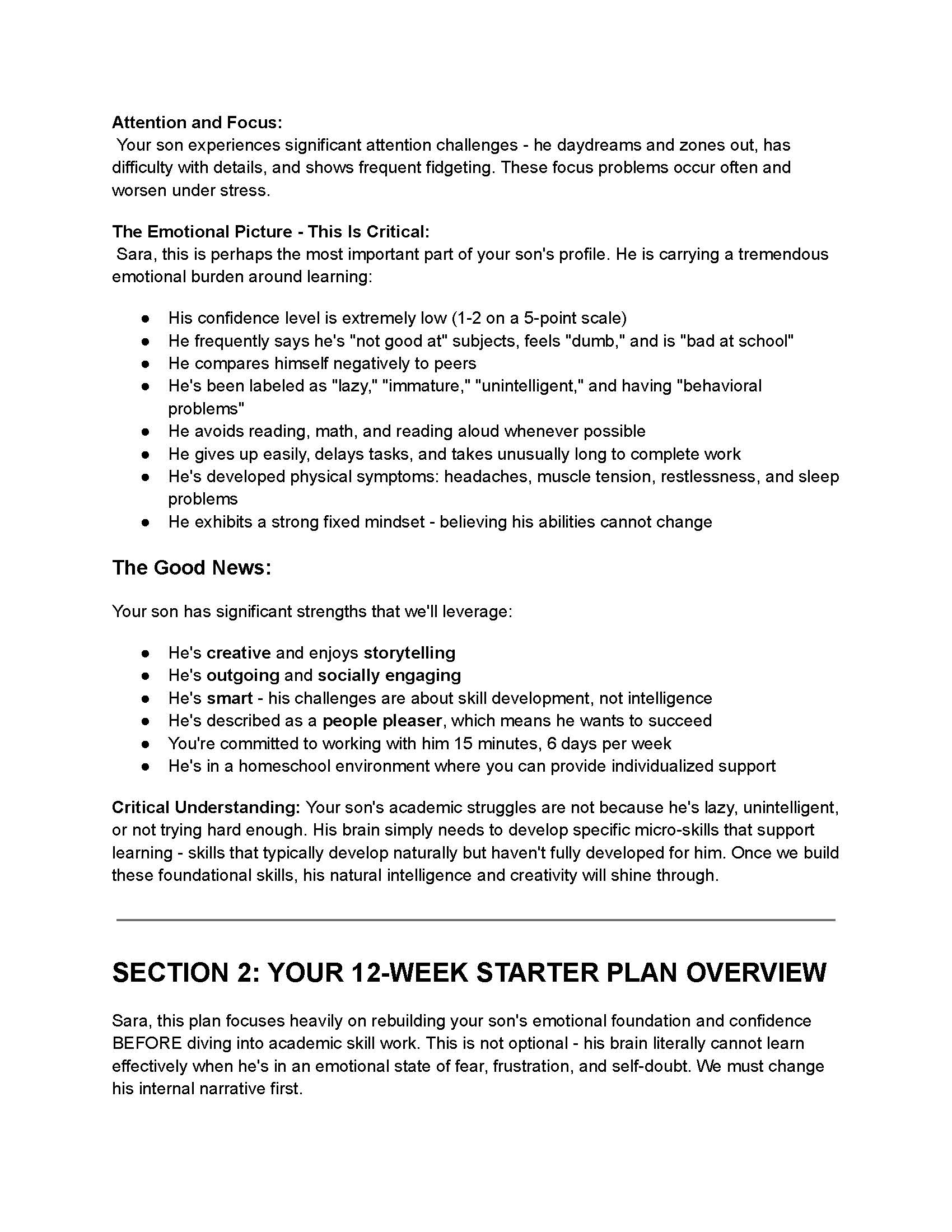 “Before the report I was convinced my daughter was ‘broken.’ After reading the executive summary I literally cried tears of relief—it showed exactly which foundational skills she was missing and proved they’re 100% trainable. The daily routine alone has ended our homework battles. Thank you for giving us hope again.”